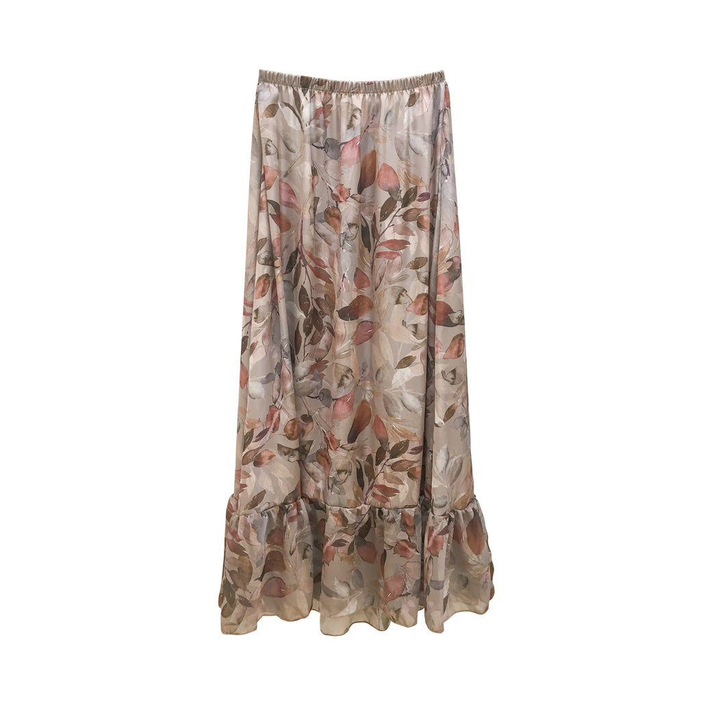 Style notes: elastic waist band, moderate slit, ruffle edge.